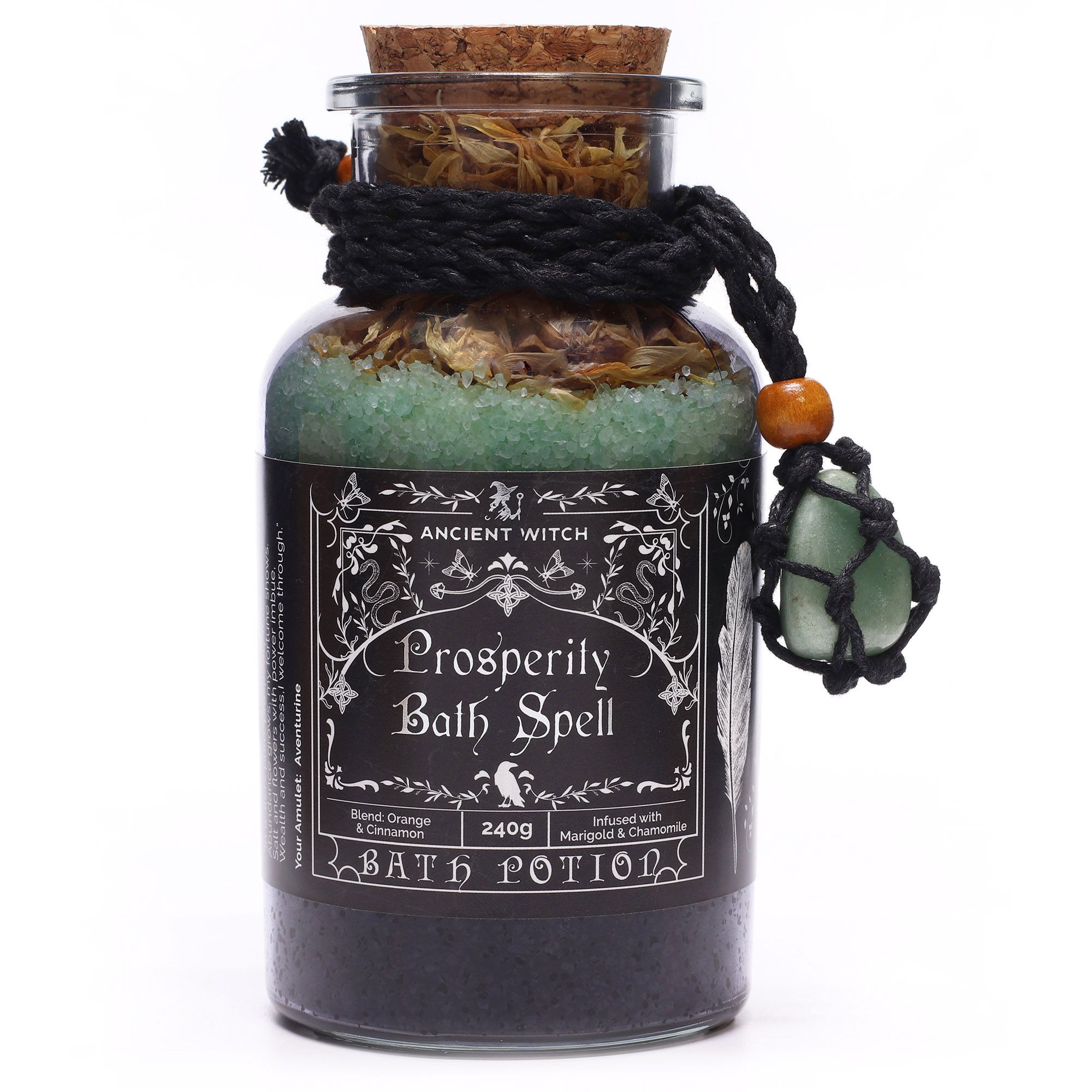 Ancient Witch Bath Spell Potion & Aventurine Crystal Amulet – Prosperity Step into abundance with the Prosperity Bath Spell Potion from Ancient Witch. This luxurious bath potion blends orange and cinnamon essential oils with marigold and chamomile, inviting positivity and growth into your life. Handcrafted with care, each 240g potion comes in a glass apothecary-style bottle sealed with a cork lid and adorned with an Aventurine crystal amulet tied in black cord. Aventurine is traditionally associated with luck, wealth, and new opportunities – perfect for setting intentions during your self-care rituals.Simply pour a handful into warm bath water and soak in the aromatic blend designed to awaken the senses and attract prosperity. Whether part of your spiritual practice or a mindful bath routine, this potion makes a unique gift or altar addition.Vegan-friendly and cruelty-free. Made with natural botanicals and pure essential oils.