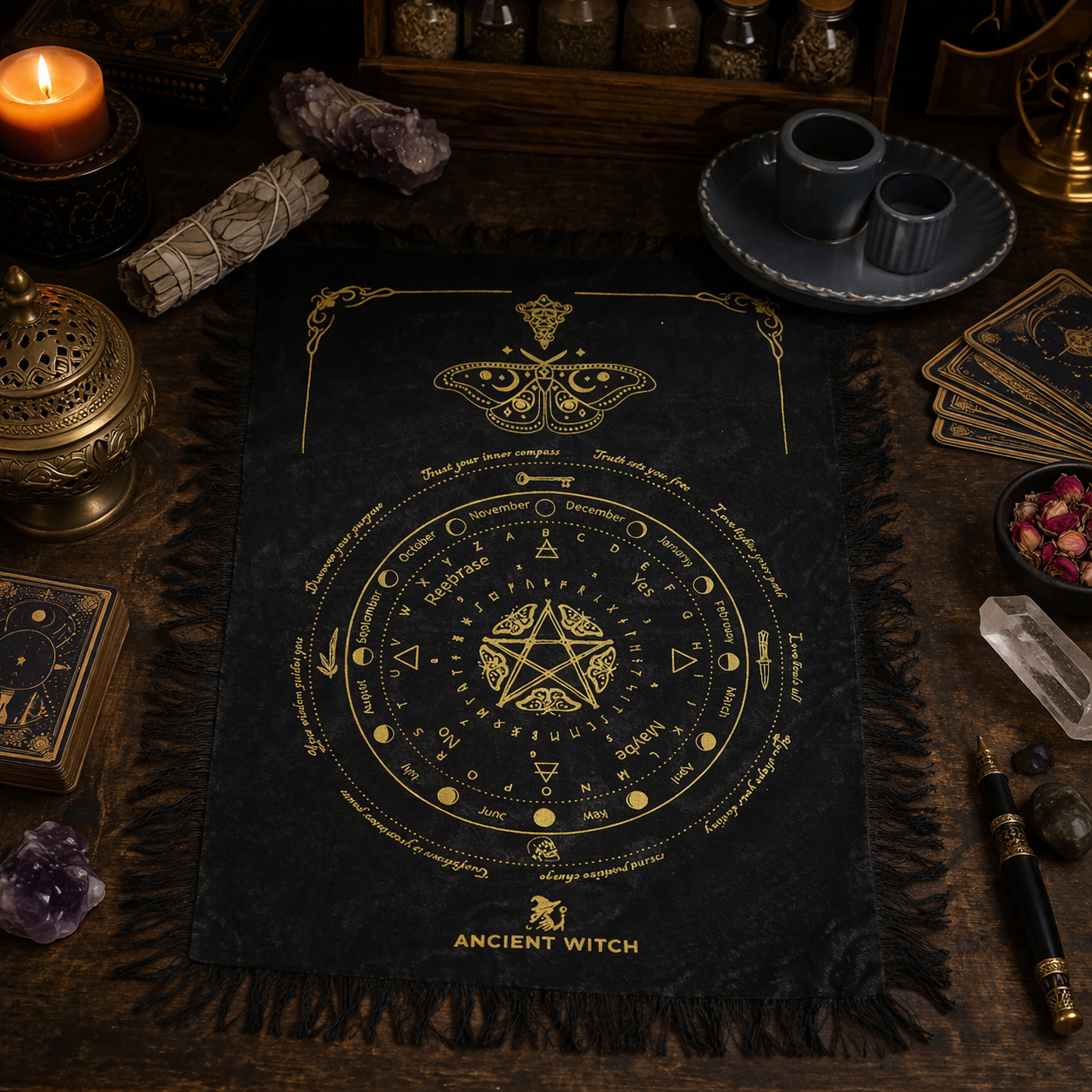 Add a touch of elegance and mystery to your readings with the Ancient Witch Mystic Moth Pendulum Divination Cloth in Black & Gold. The beautifully detailed moth design sits above a circular divination layout, creating a striking focal point for pendulum readings and spiritual rituals. The deep black fabric combined with gold-toned print gives this cloth a refined, premium feel, while the soft fringe edges add a handcrafted finish. Perfect for pendulum work, tarot spreads, crystal layouts, or altar styling, it helps create a calm and intentional space for your practice.Ideal for those drawn to celestial symbolism and mystical aesthetics, this divination cloth brings atmosphere and meaning to any spiritual setup.