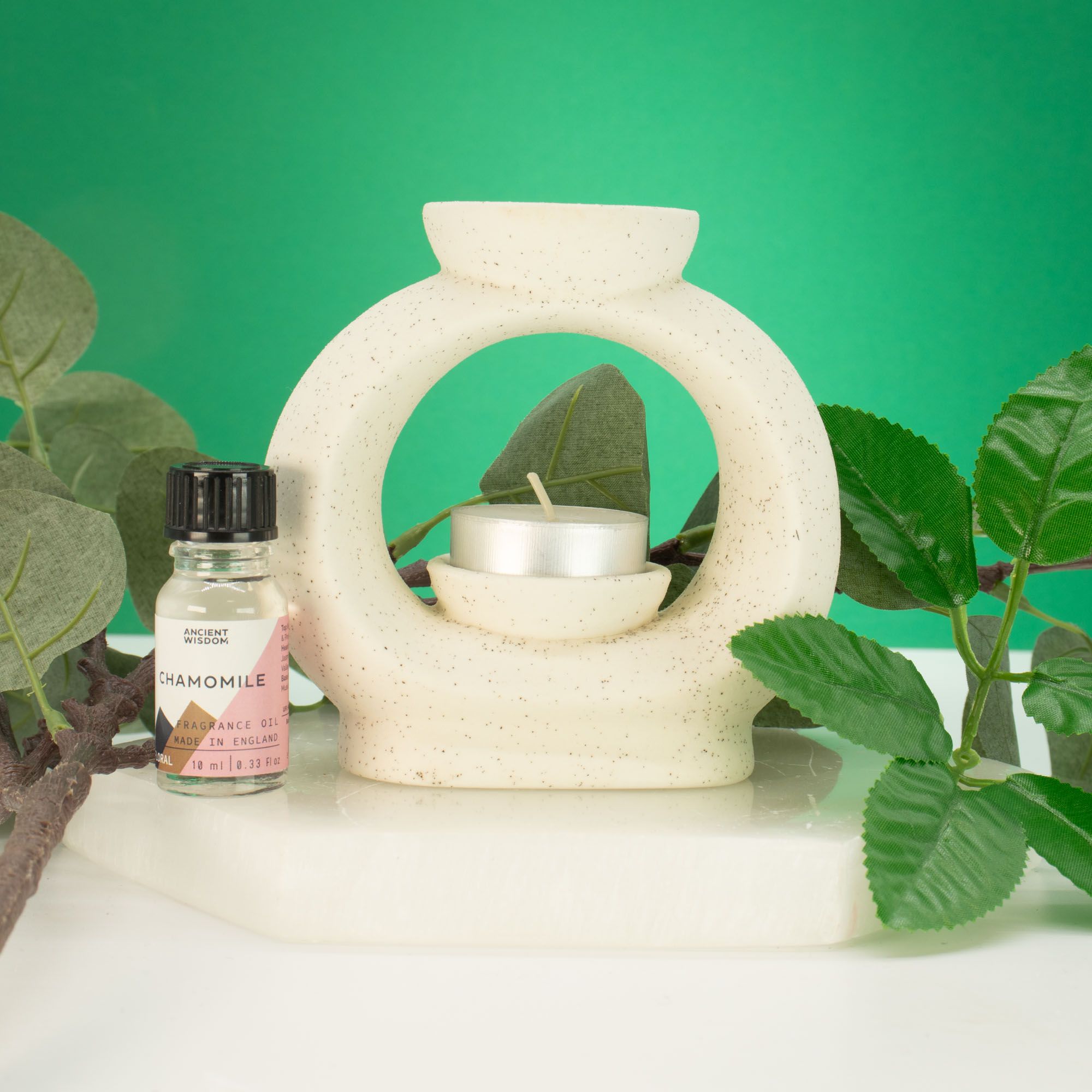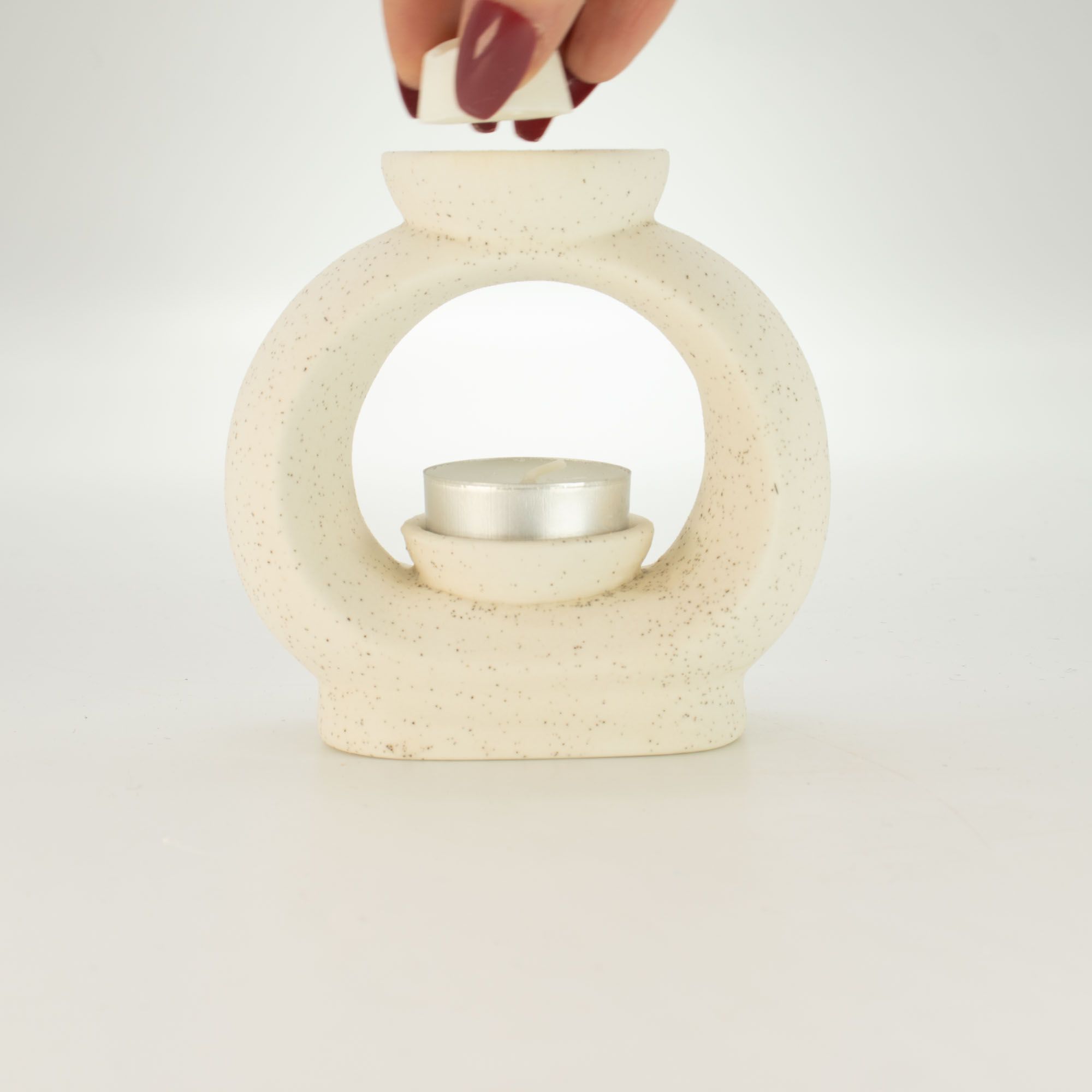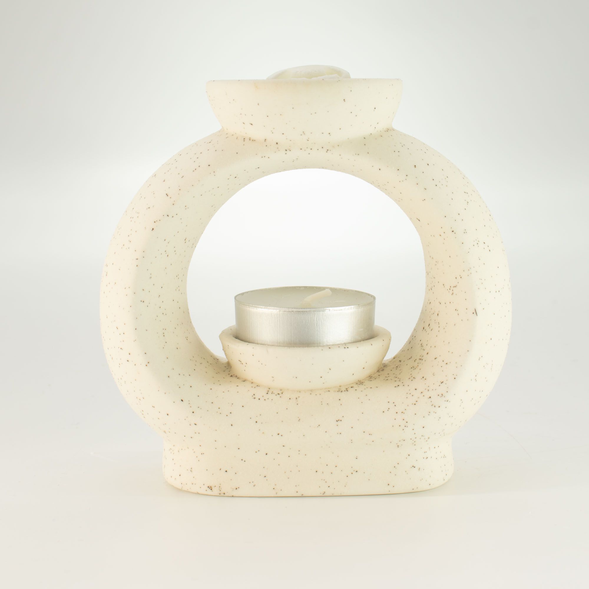 Add a modern decorative accent to your space with the Ceramic Zen Oil Burner – Large Oval Pebble in Speckled Off-White. Its flowing oval form and soft speckled finish create a calm, contemporary look while gently releasing your favourite fragrances. The sculptural design is inspired by smooth natural stones, giving the burner a balanced and organic appearance. A wide dish at the top holds fragrance oils or wax melts, while a tealight candle placed on the inner platform warms the dish to slowly diffuse scent throughout the room.The speckled off-white glaze adds a subtle handcrafted character, allowing the burner to blend effortlessly with modern, Scandinavian, or nature-inspired interiors. The open circular form also lets the candlelight shine through, creating a soft ambient glow when in use.Both decorative and functional, this larger Zen-style burner is ideal for living rooms, bedrooms, or relaxation spaces, offering a stylish way to enjoy essential oils, fragrance oils, or wax melts while adding a peaceful element to your décor.