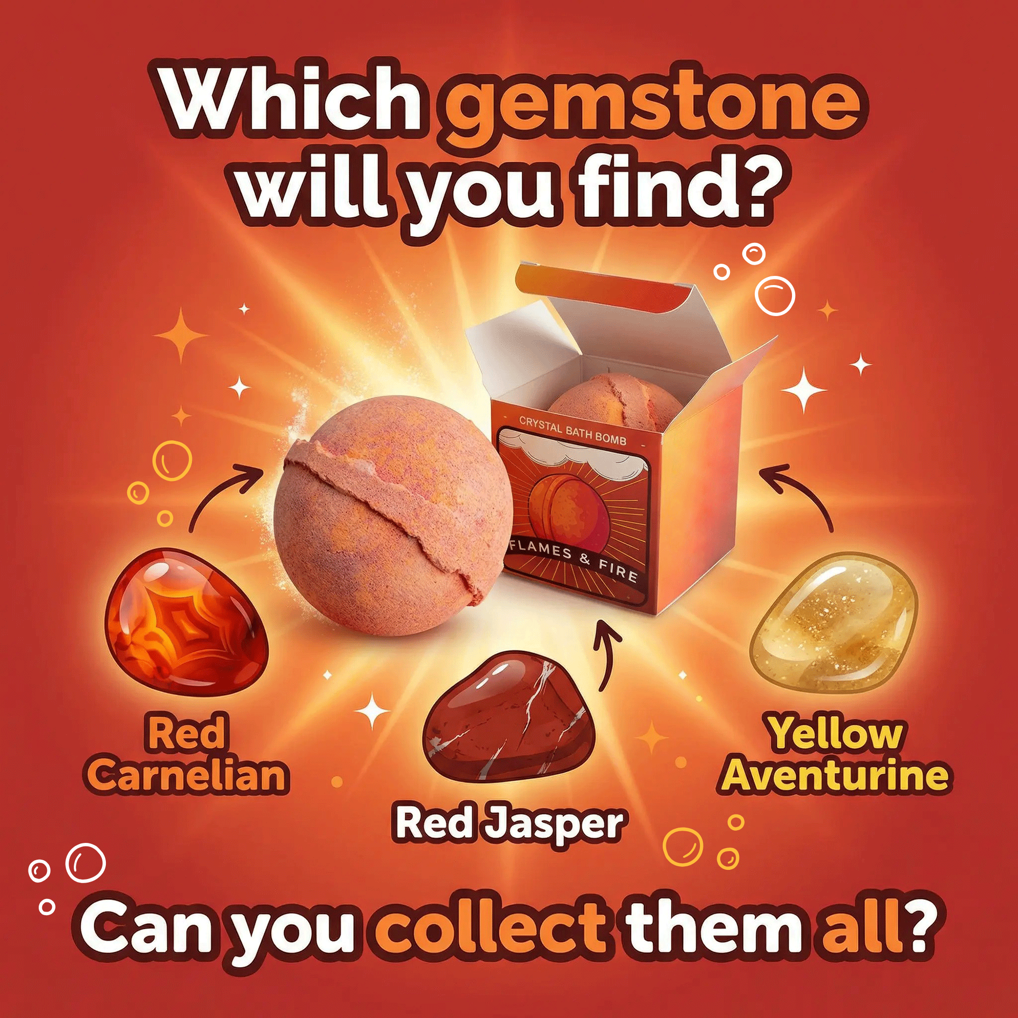 Ignite your bath with warmth, energy, and a touch of surprise. The Fire Crystal Bath Bomb transforms your soak into a vibrant, sensory experience, bursting with fiery colours and a rich, uplifting fragrance that fills the room. As it slowly fizzes, the water comes alive with glowing orange and red tones – creating a relaxing yet energising atmosphere. But the real magic is hidden inside. Once dissolved, a genuine gemstone is revealed, turning an everyday bath into a moment of discovery. Inside each bath bomb, you’ll discover one of three different real gemstones – making every soak a surprise – collect them all!Perfect for unwinding after a long day or adding a little excitement to your self-care routine, this bath bomb is designed to delight from start to finish. Whether as a gift or a treat for yourself, it’s an experience you’ll want to repeat.