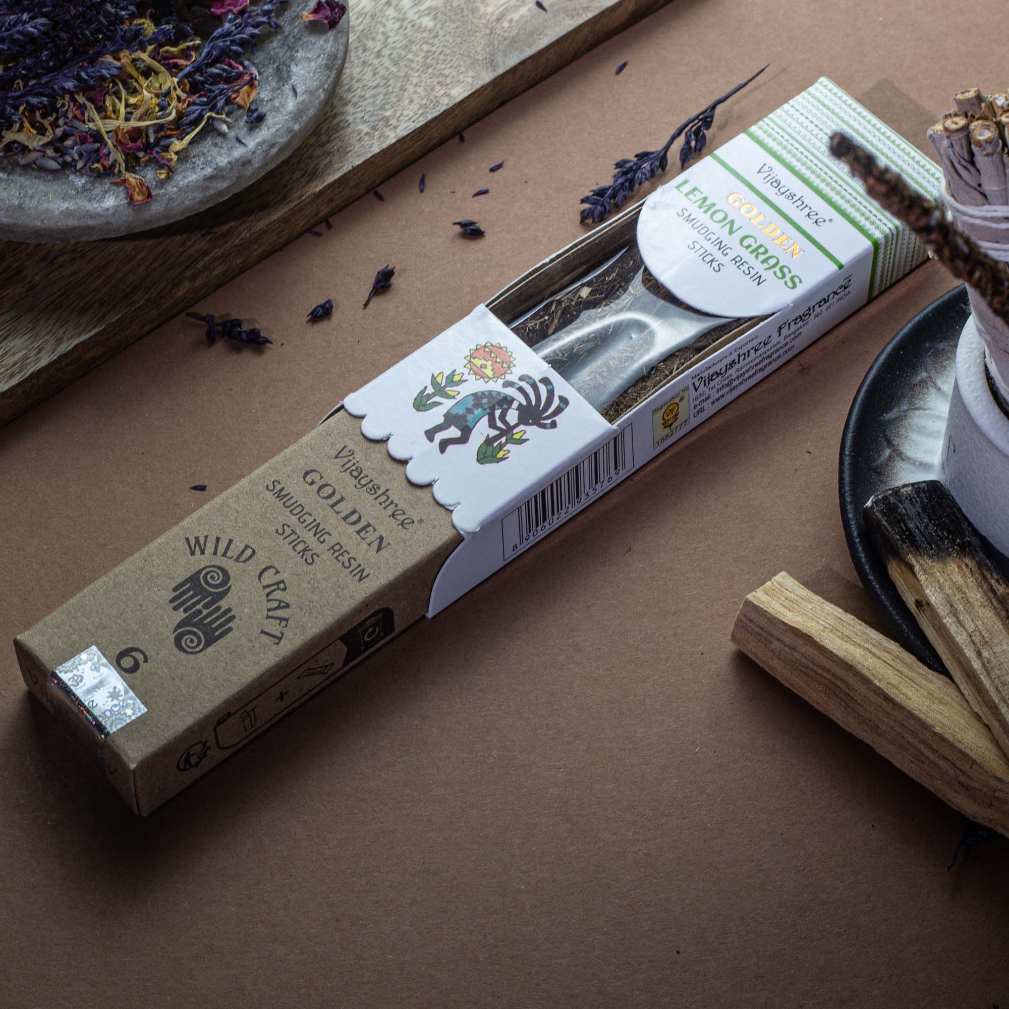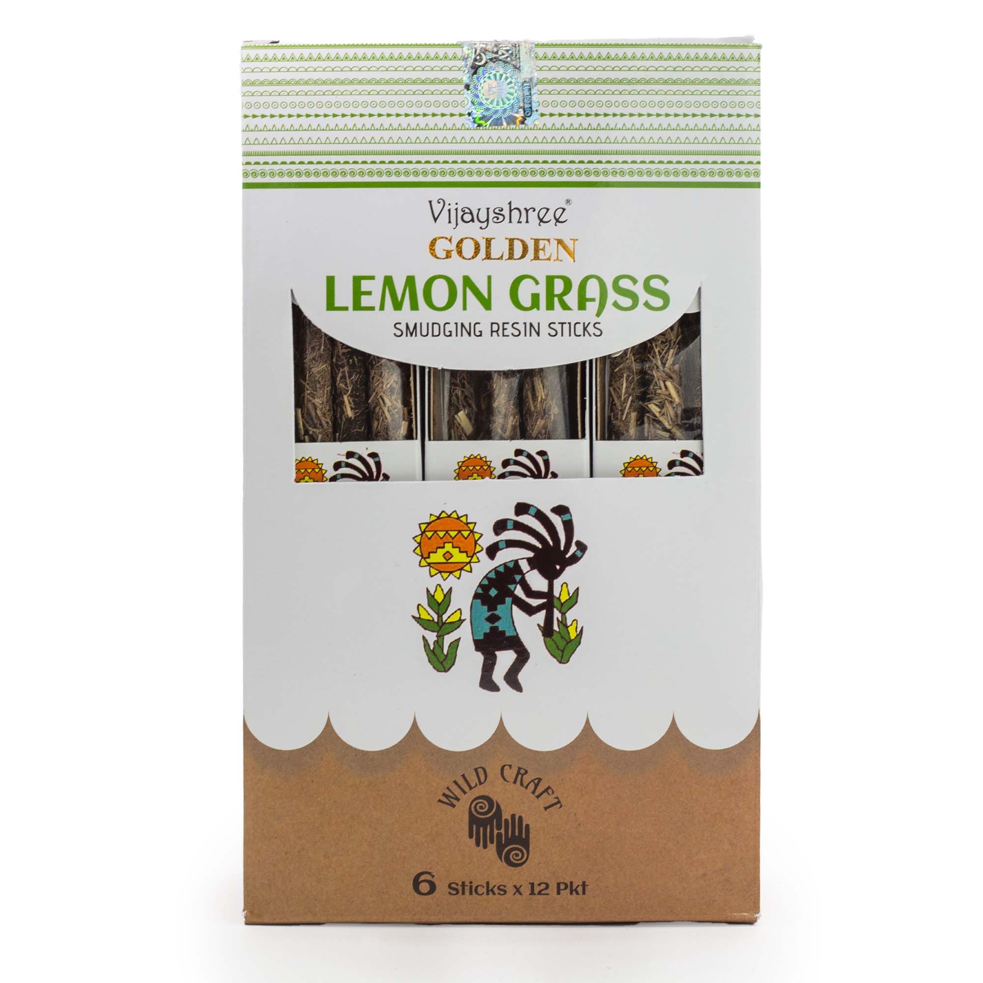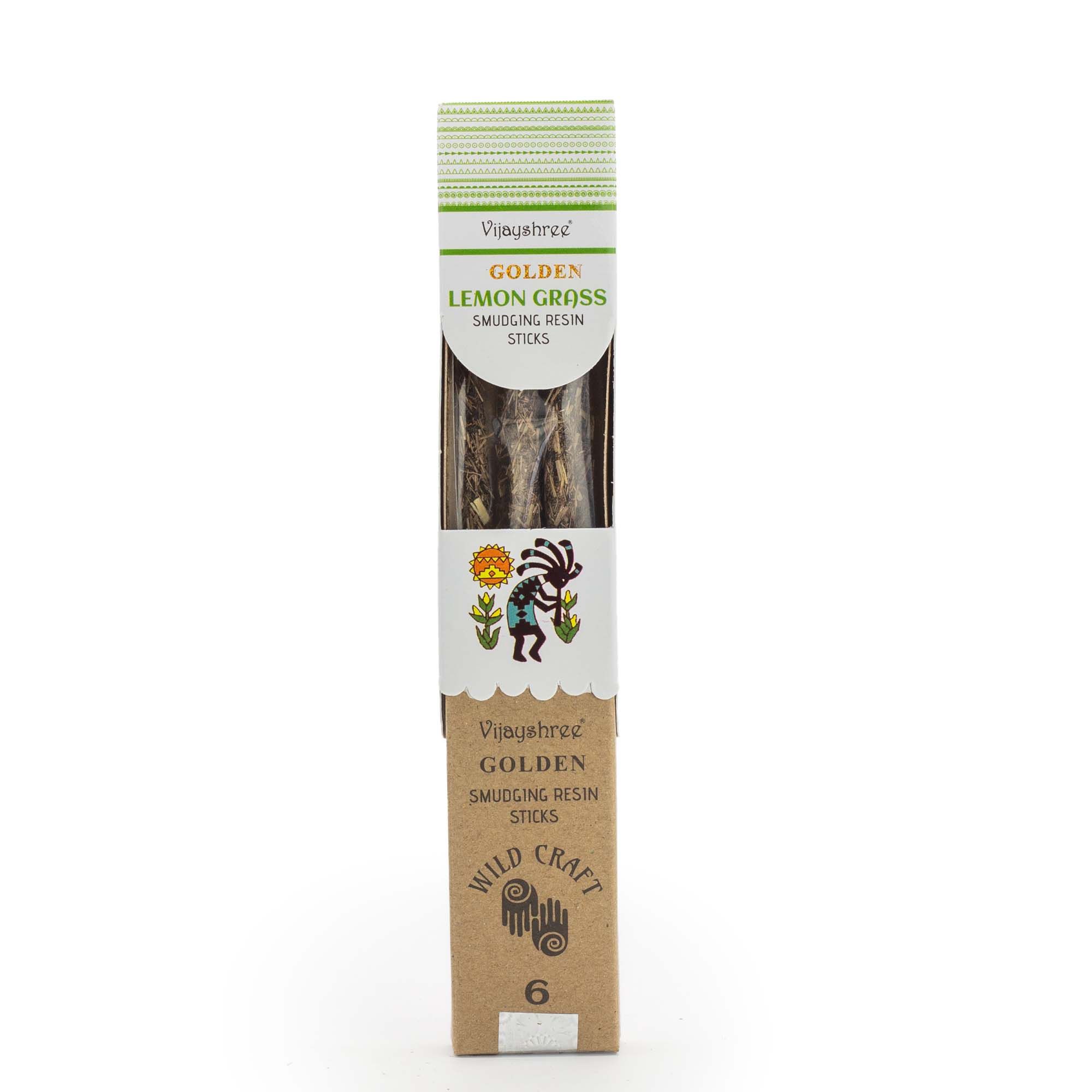 A bright smudging incense made with lemongrass resin, formed into solid sticks with a textured, natural finish. Fresh, citrusy and lightly herbal, the scent feels clean and uplifting, bringing a sense of clarity and lightness to the space. This pack contains approximately 30g of Golden Lemon Grass smudging resin sticks, presented in an illustrated box with inner wrapping. The sticks are easy to handle and suitable for burning on a heat-resistant surface or incense holder. When lit, they release a crisp lemongrass-led aroma with a dry, resinous edge rather than a sharp or overly zesty note.Each stick varies slightly in colour and texture, reflecting its resin-based composition and traditional crafting process. The natural presentation and refreshing fragrance give the product a simple, ritual-inspired feel, making it well suited to energising mornings, clearing the atmosphere, or adding a fresh touch to mindful routines.