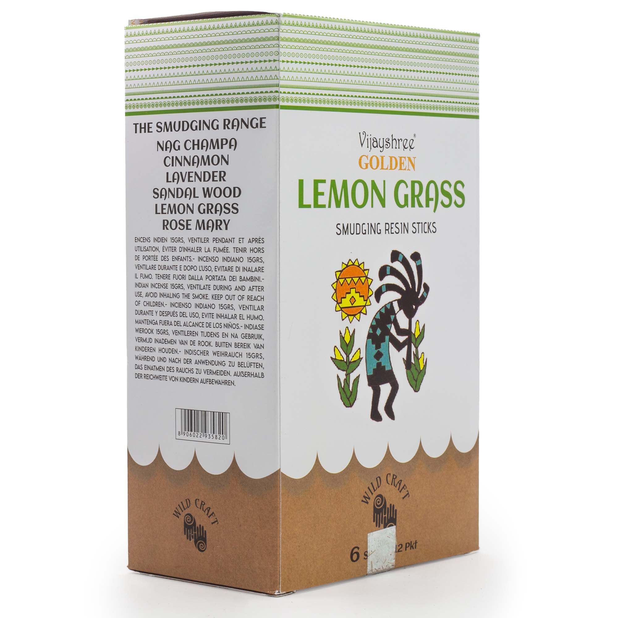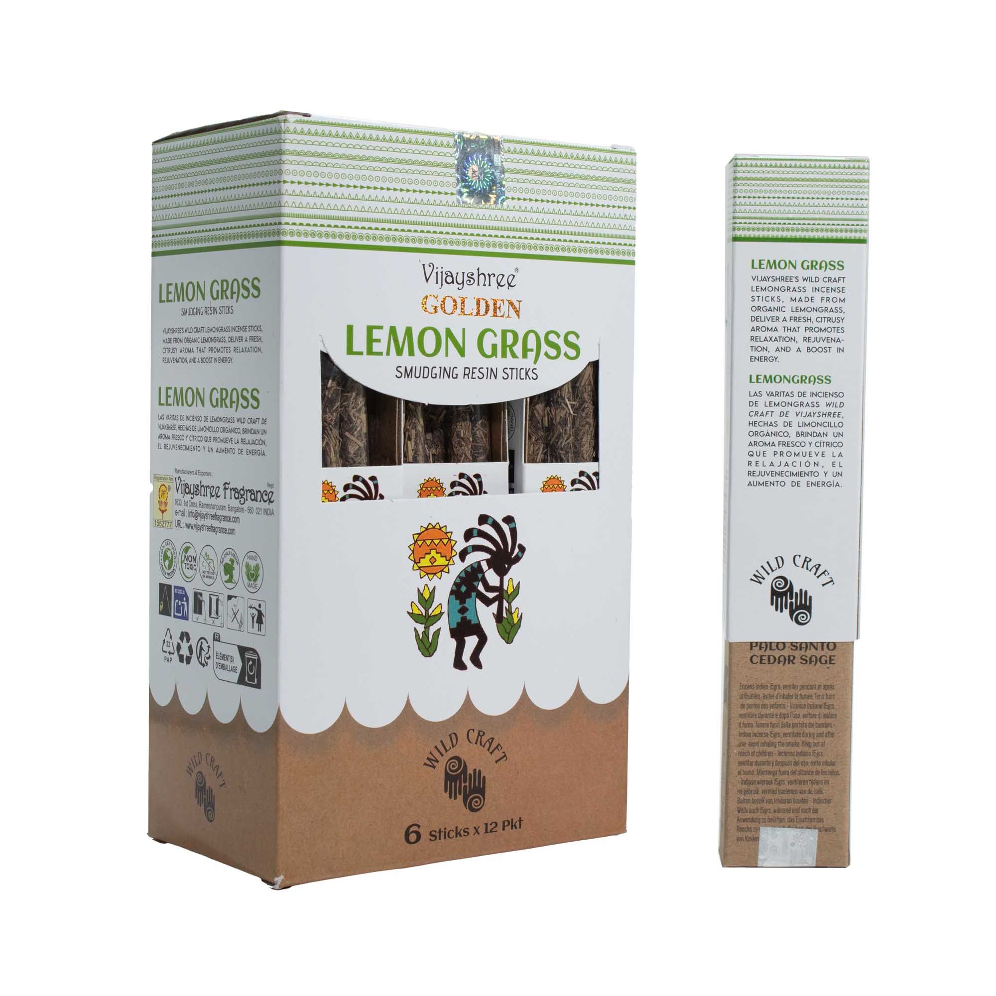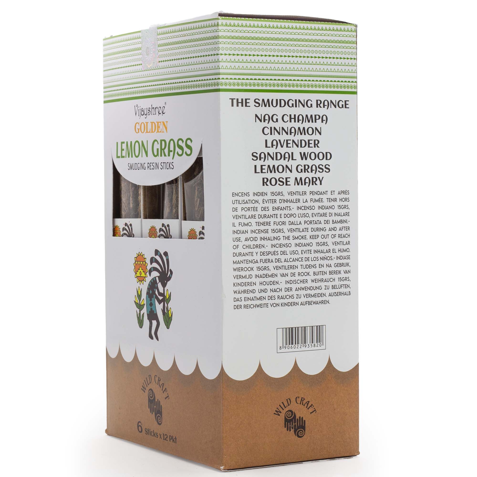 A bright smudging incense made with lemongrass resin, formed into solid sticks with a textured, natural finish. Fresh, citrusy and lightly herbal, the scent feels clean and uplifting, bringing a sense of clarity and lightness to the space. This pack contains approximately 30g of Golden Lemon Grass smudging resin sticks, presented in an illustrated box with inner wrapping. The sticks are easy to handle and suitable for burning on a heat-resistant surface or incense holder. When lit, they release a crisp lemongrass-led aroma with a dry, resinous edge rather than a sharp or overly zesty note.Each stick varies slightly in colour and texture, reflecting its resin-based composition and traditional crafting process. The natural presentation and refreshing fragrance give the product a simple, ritual-inspired feel, making it well suited to energising mornings, clearing the atmosphere, or adding a fresh touch to mindful routines.
