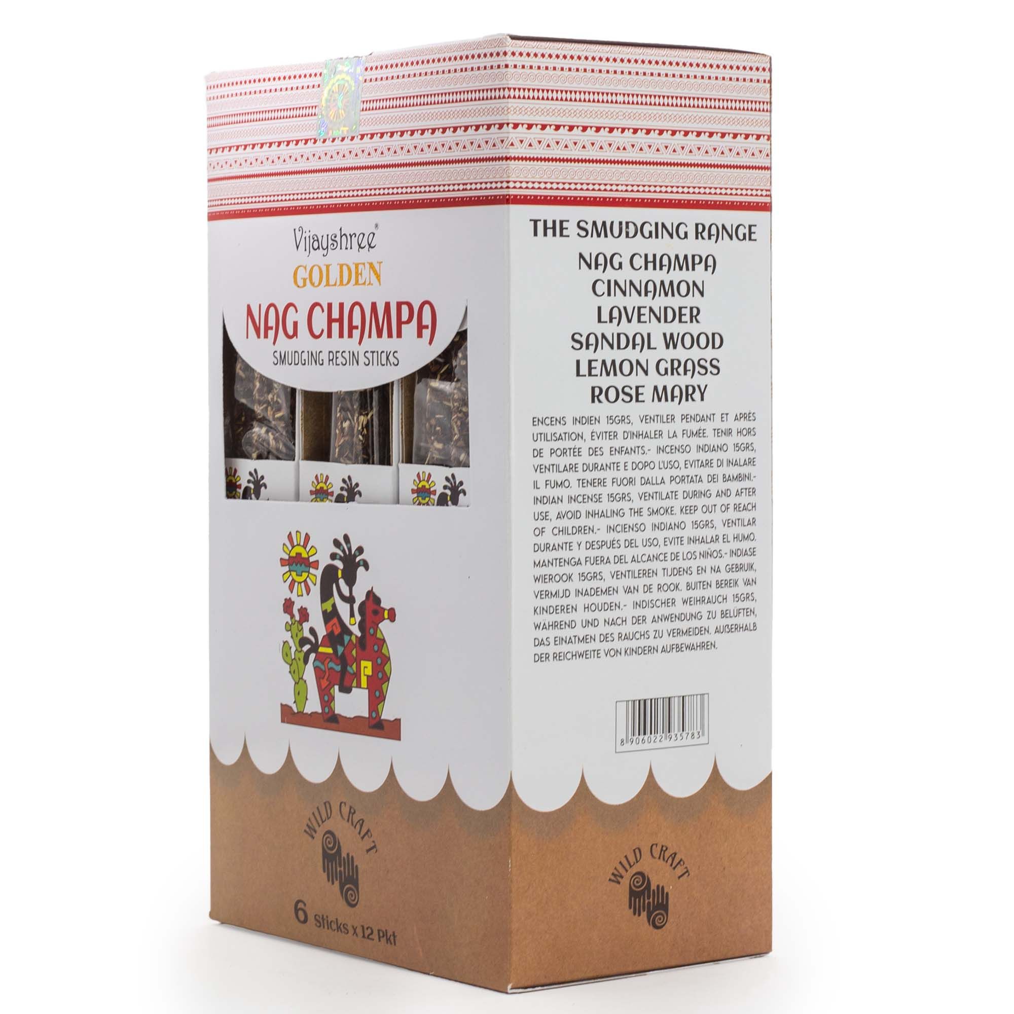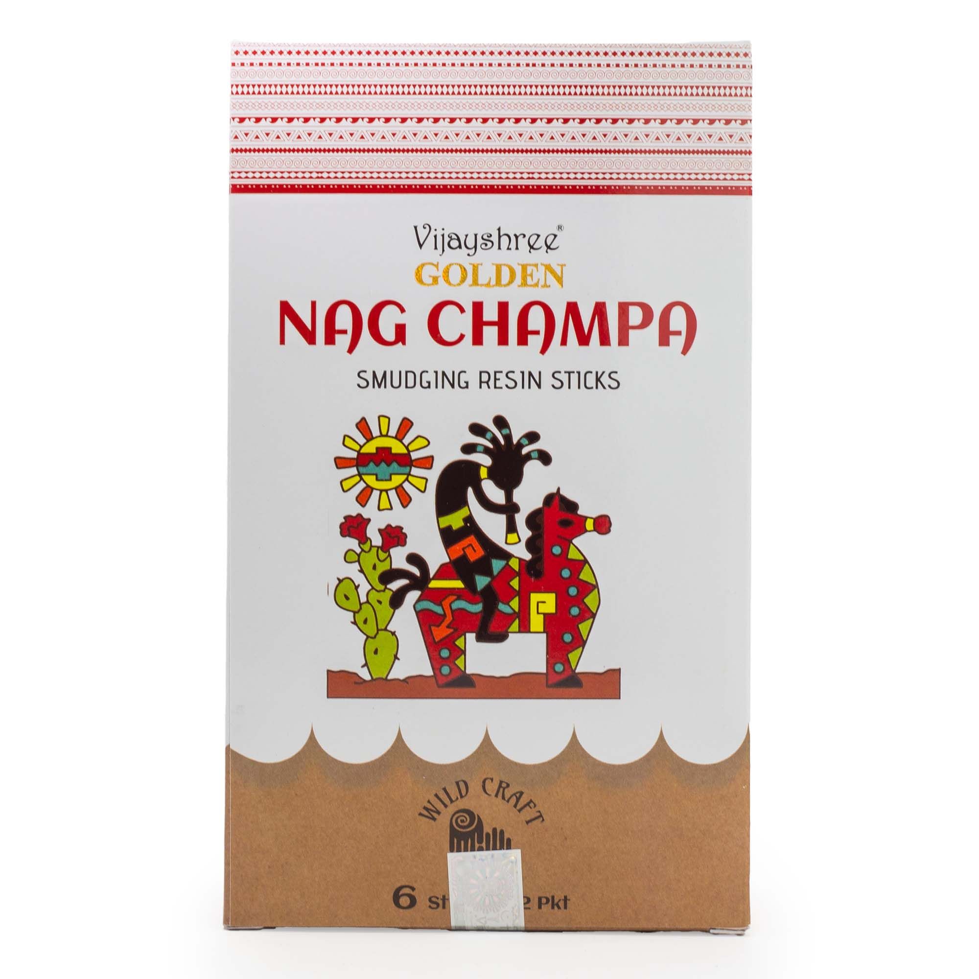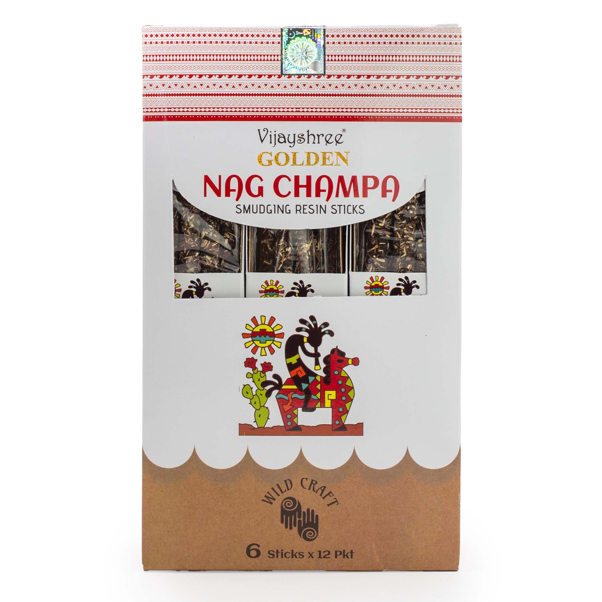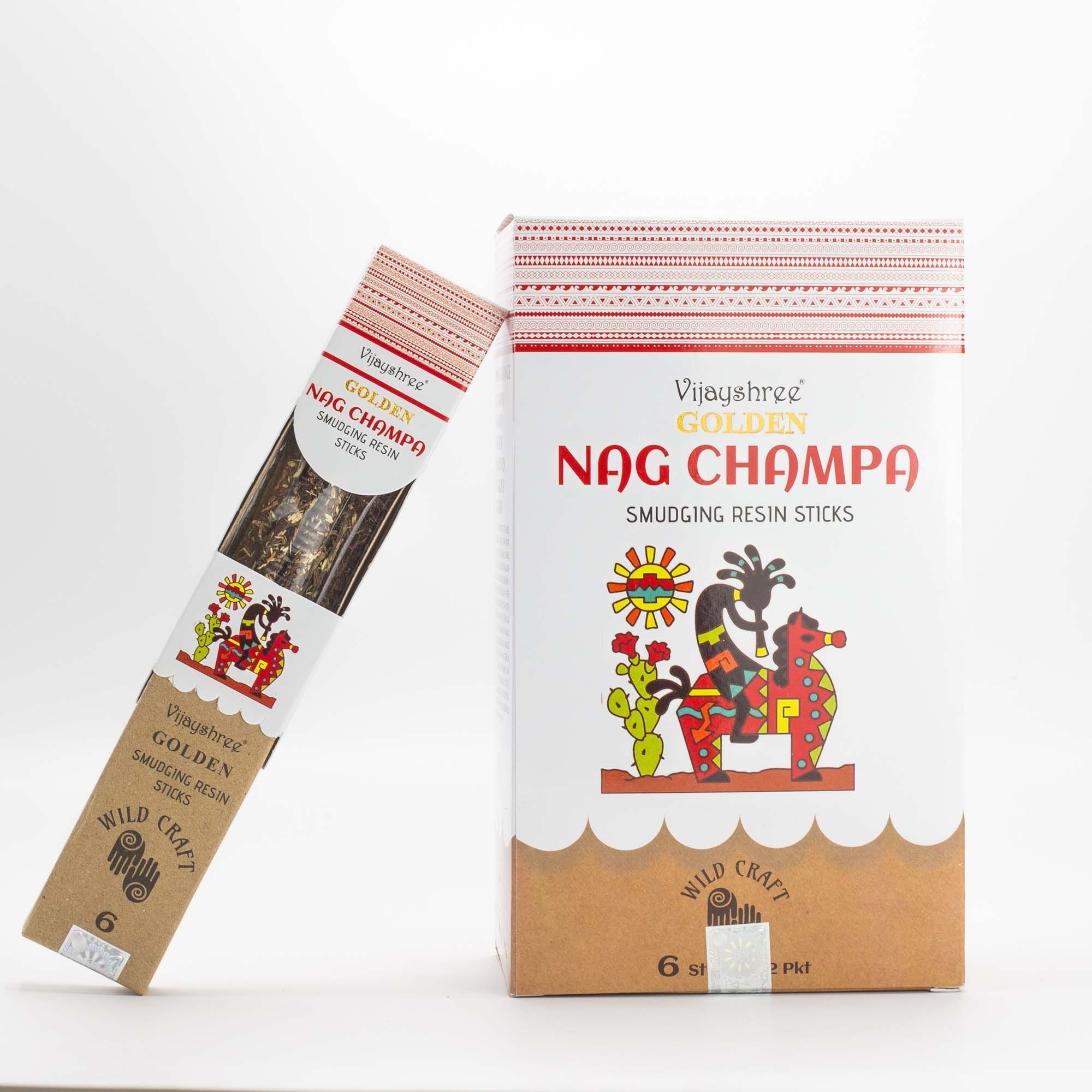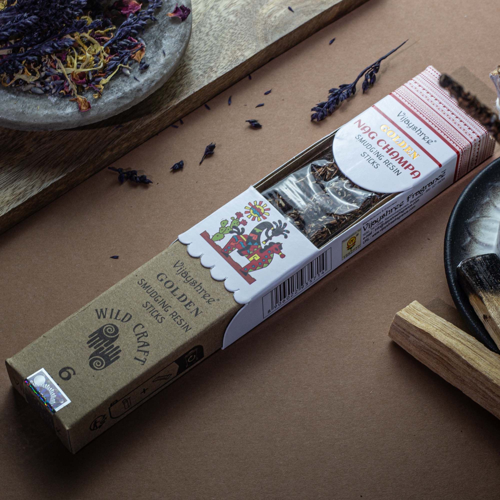 A traditional smudging incense made with nag champa resin, formed into solid sticks with a textured, natural finish. Rich, warm and slightly sweet, the scent carries soft floral notes layered with a gentle woody depth, creating a soothing and familiar atmosphere. This pack contains approximately 30g of Golden Nag Champa smudging resin sticks, presented in an illustrated box with inner wrapping. The sticks are easy to handle and suitable for burning on a heat-resistant surface or incense holder. When lit, they release a rounded nag champa aroma with a dry, resinous base rather than an overly sweet or heavy fragrance.Each stick varies slightly in colour and texture, reflecting its resin-based composition and traditional crafting process. The natural presentation and classic scent give the product a calm, ritual-inspired feel, making it well suited to meditation, spiritual practices, or creating a relaxed, ambient space at home.