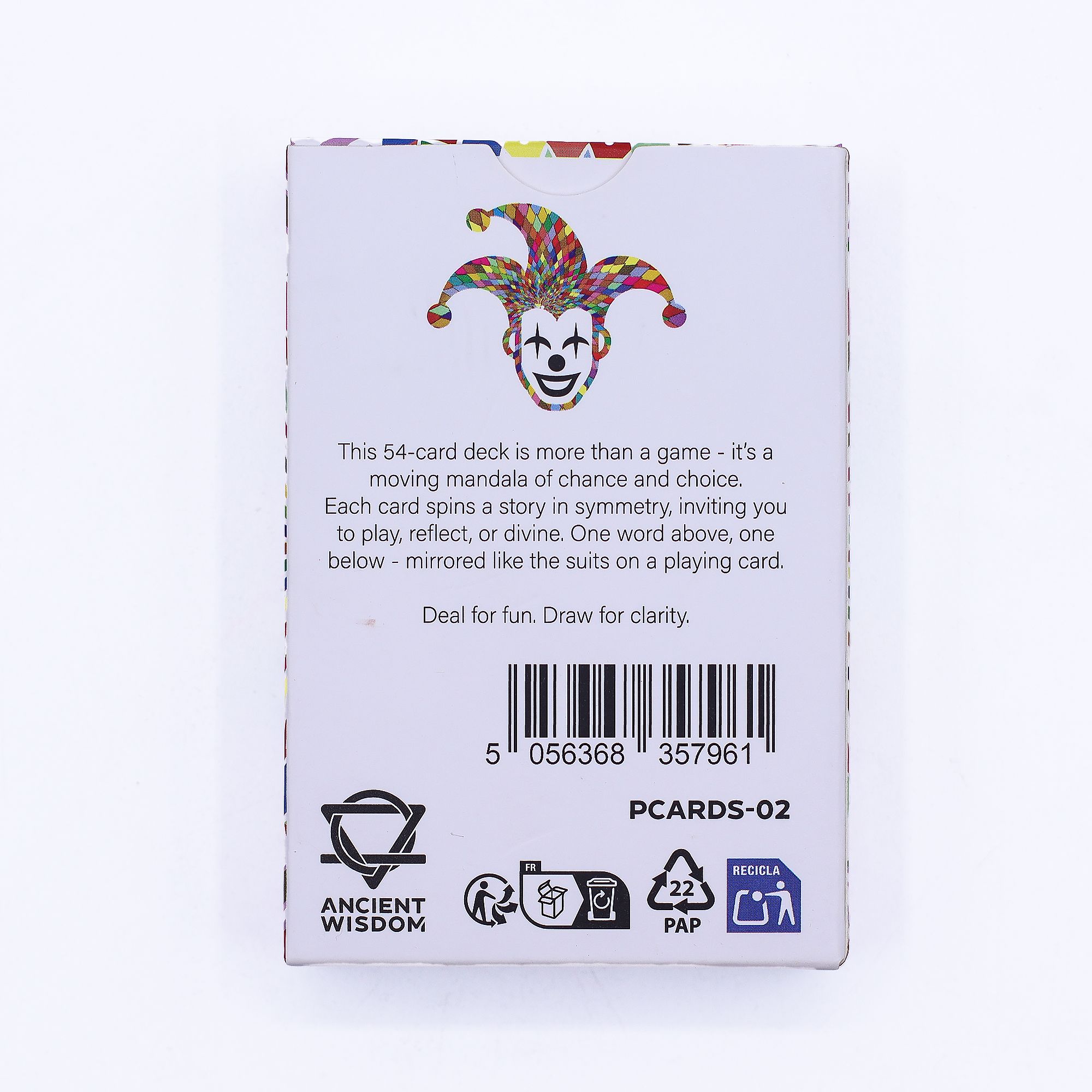 Mandala Playing & Oracle Cards – Kaleidoscope Symmetry This luminous 54-card deck brings colour, clarity, and reflection to your table. Use it for classic card games or as an oracle for mindful insight — each mandala design echoes the balance of life’s choices and the harmony between play and purpose. Each card is illustrated with intricate kaleidoscopic patterns and mirrored words, allowing two interpretations — one upright, one reversed — for deeper reading and personal reflection. Whether you deal for fun or draw for guidance, this deck invites stillness, connection, and a moment of beauty in motion.Perfect for those who love art, meditation, or meaningful play. A mindful gift for any modern mystic or creative spirit.