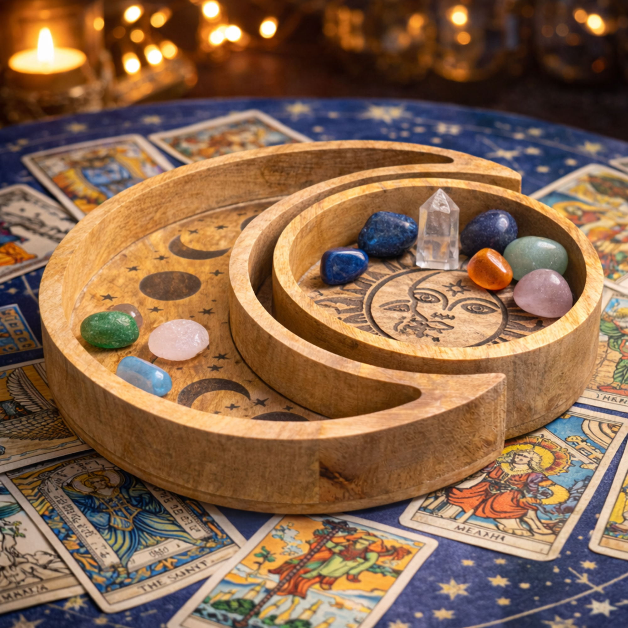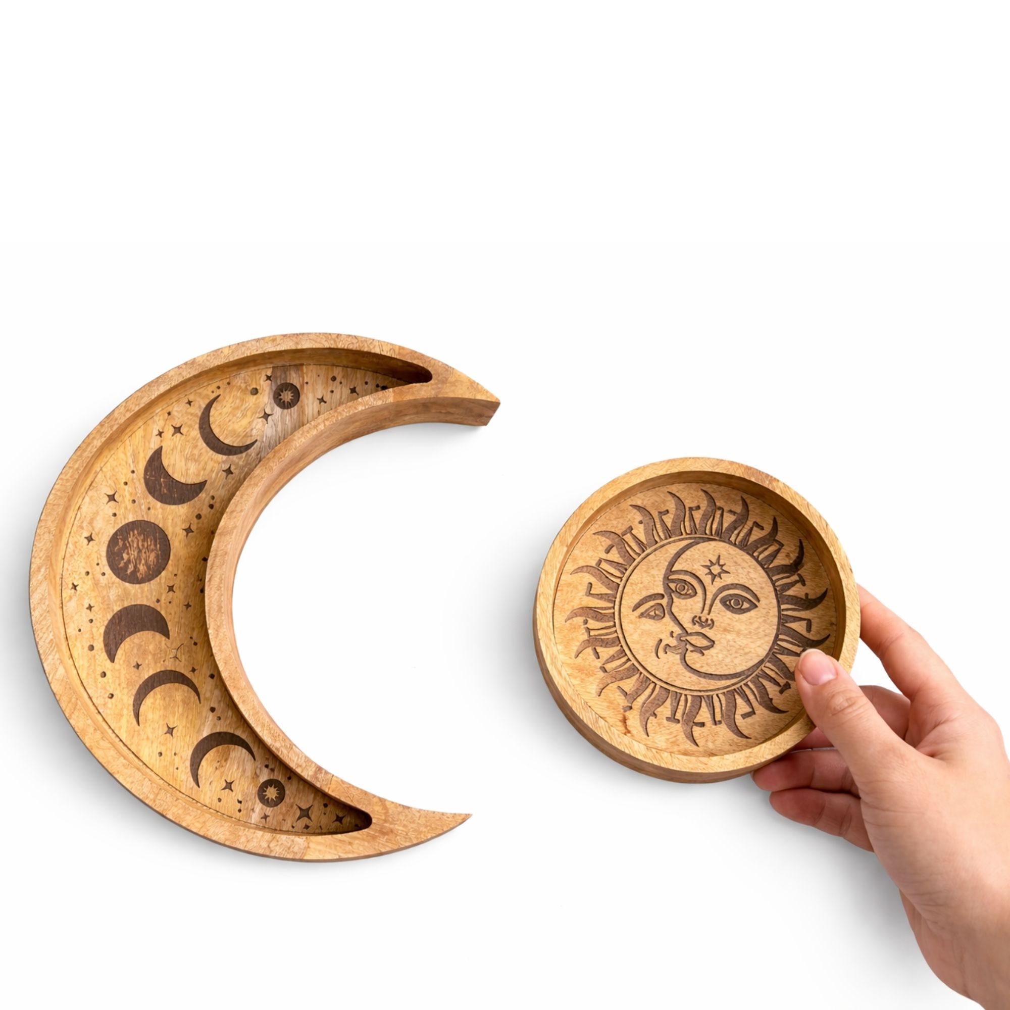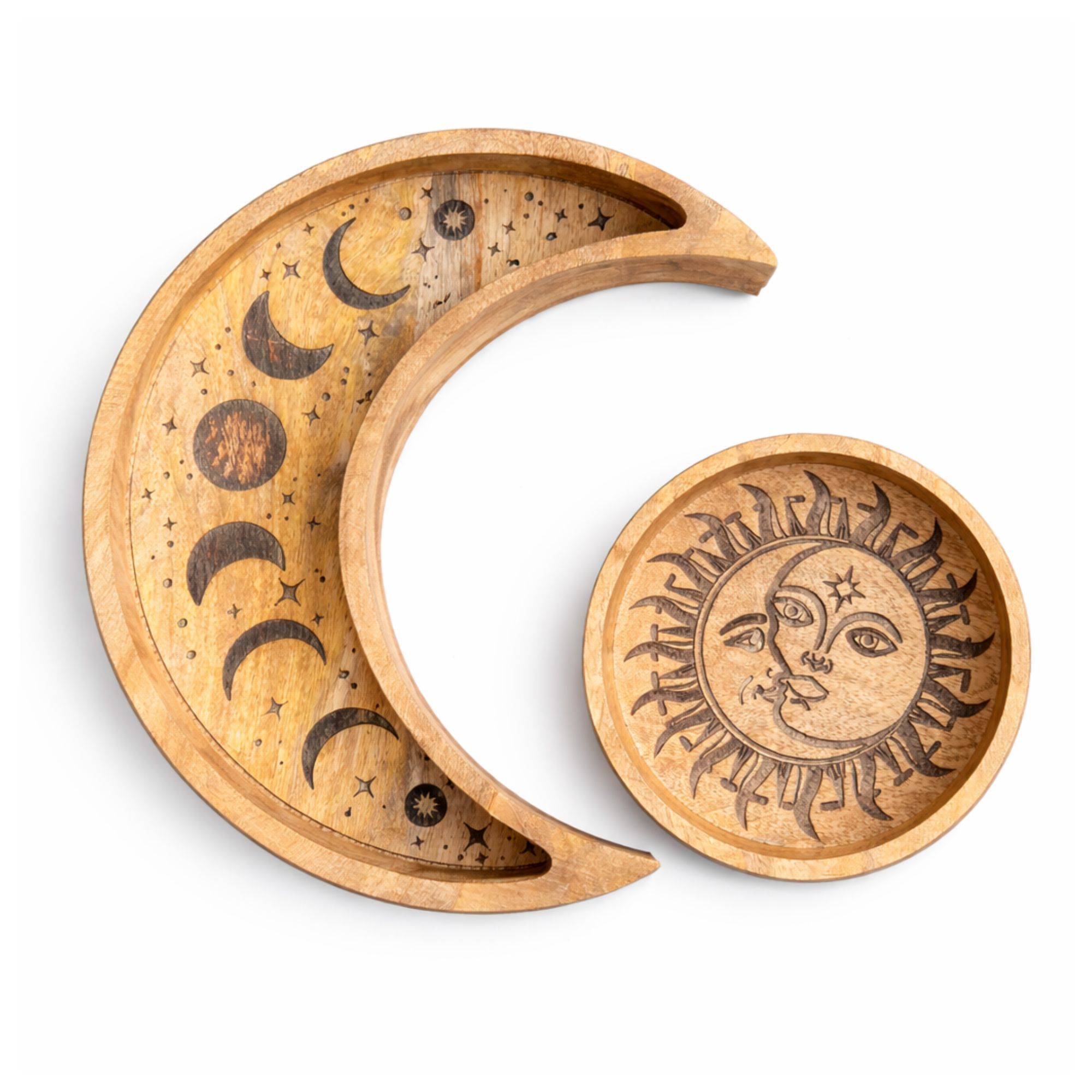 Add a celestial touch to your space with this Moon Shaped Round Tray Set. Featuring a beautifully carved crescent moon tray paired with a matching round sun tray, this decorative set brings both style and practicality to any setting. Perfect for displaying crystals, candles, jewellery, or small ritual items, these trays work beautifully together or separately. The detailed sun, moon, and star carvings create a striking focal point, making them ideal for altars, coffee tables, or retail displays.Made from natural wood, each set showcases unique grain patterns, giving every piece its own character and handcrafted feel. A thoughtful choice for spiritual décor, gift shops, or anyone drawn to celestial-inspired accessories.
