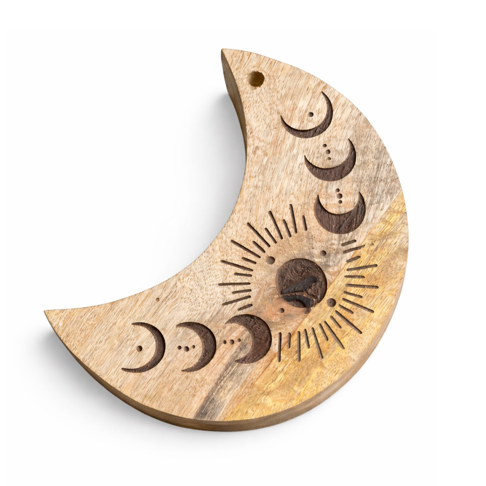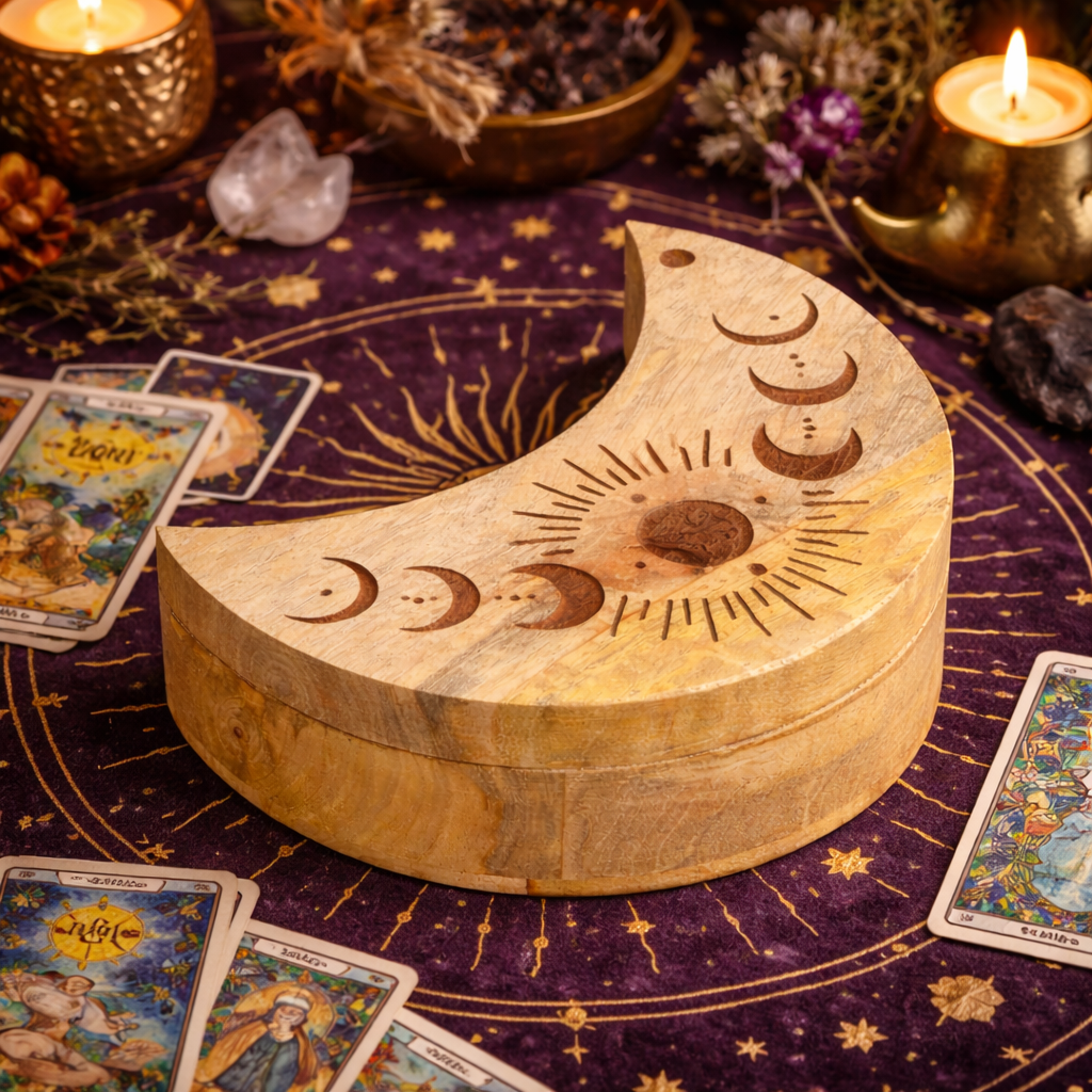 Bring a celestial touch to your collection with this beautifully crafted Moon Shaped Sliding Box. Designed in a crescent moon shape and decorated with sun and moon phase carvings, this unique piece combines decorative appeal with practical storage. The sliding lid opens smoothly to reveal a compact compartment, perfect for storing jewellery, crystals, small tarot accessories, or meaningful keepsakes. Its distinctive shape makes it a standout display piece for shelves, altars, or bedside tables.Made from natural wood, each box features its own unique grain and character, adding warmth and a handcrafted feel. Ideal for spiritual décor, gift shops, or anyone drawn to moon-inspired designs.