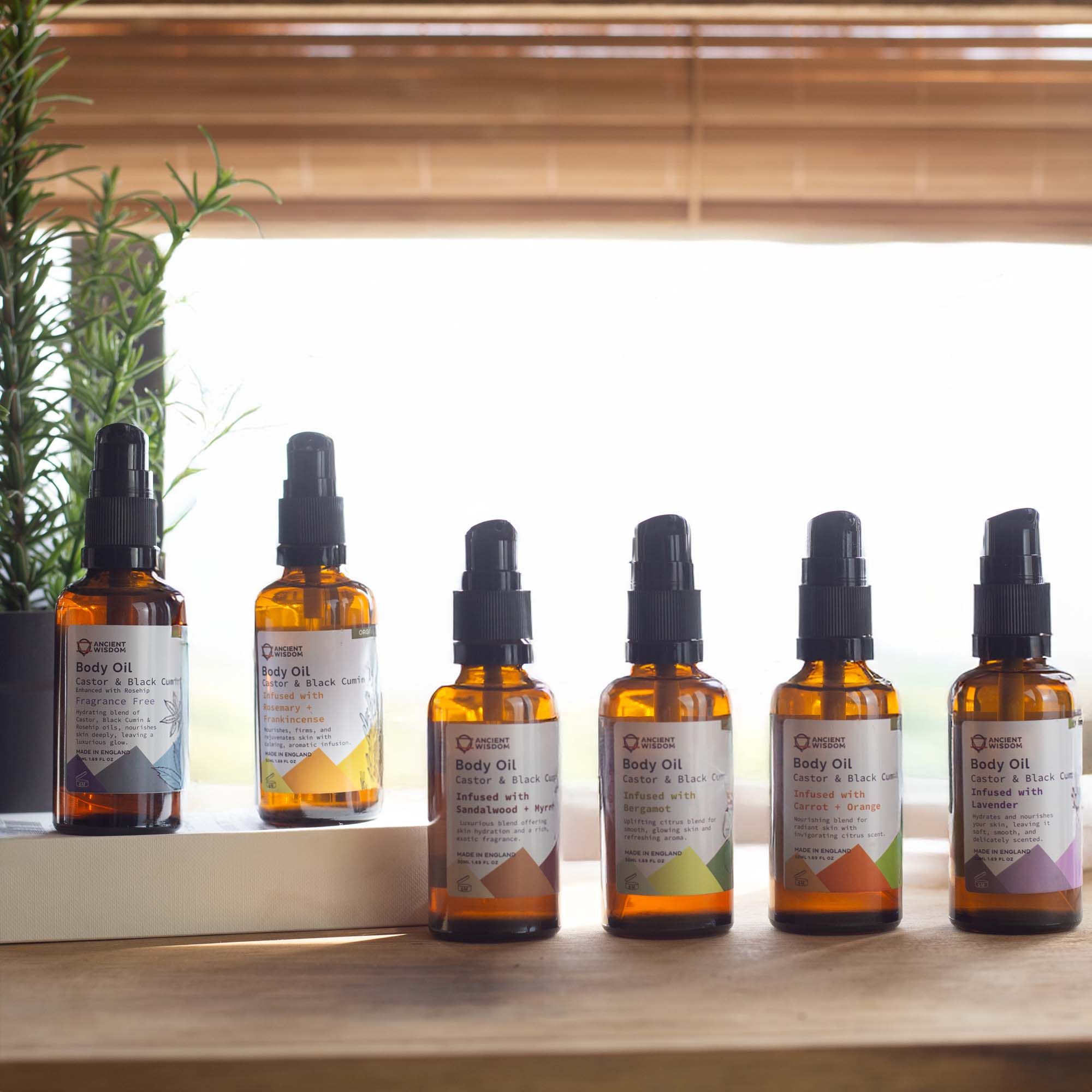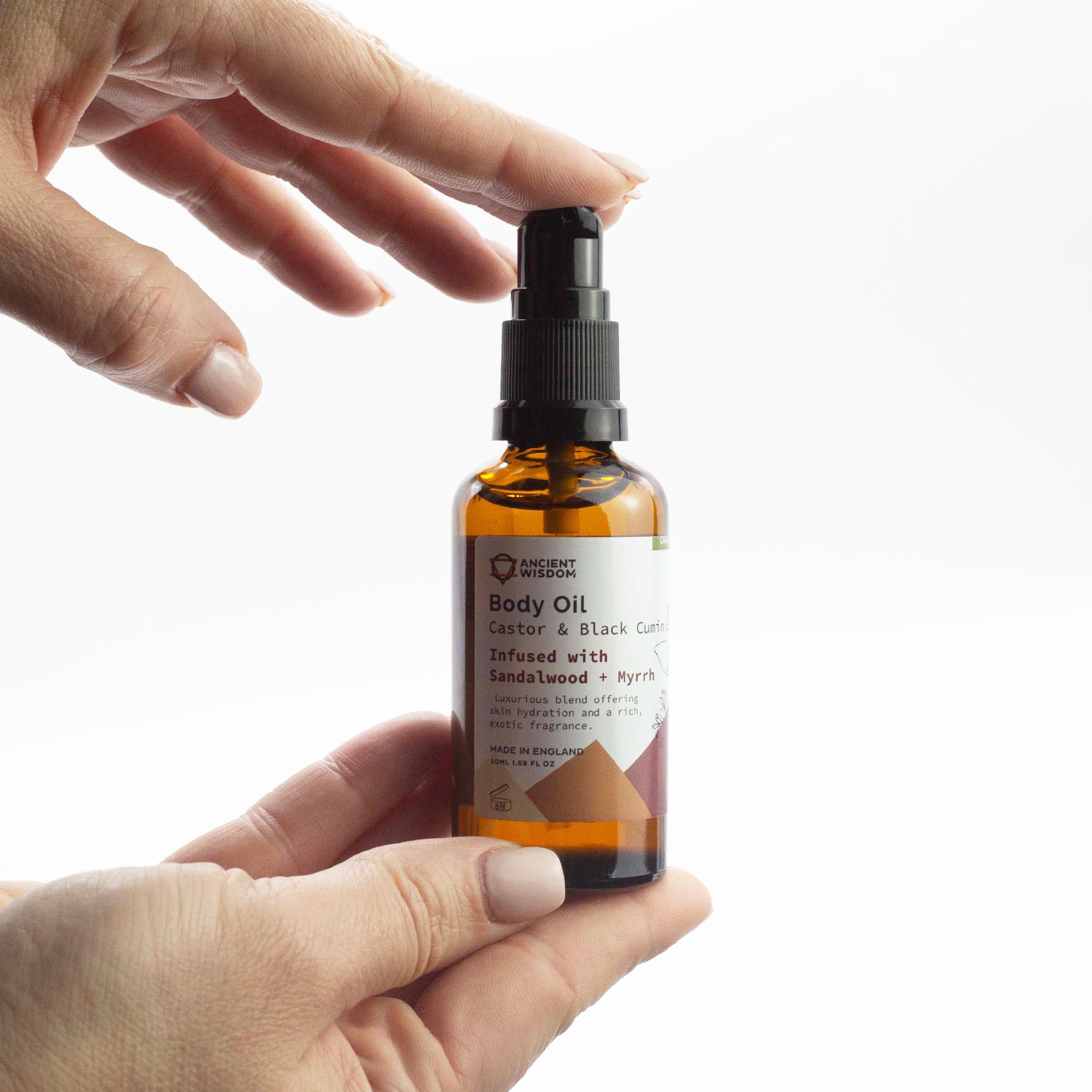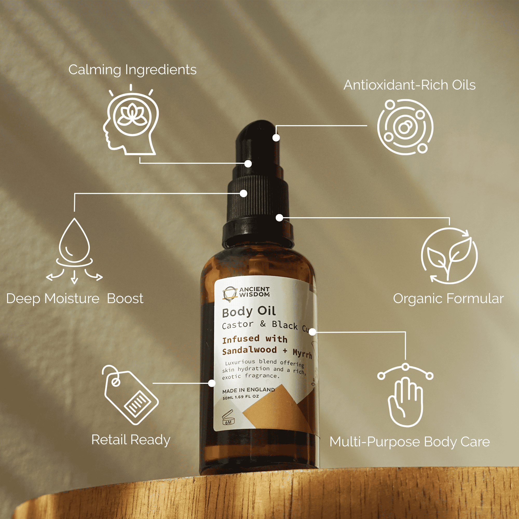 Organic Body Oil 50ml – Sandalwood & Myrrh: A Harmonious Blend for Skin and SensesImmerse yourself in luxury with our Organic Body Oil 50ml – Sandalwood & Myrrh, a rich, aromatic blend that nourishes your skin while promoting relaxation and indulgence. The woody and warm aromas of sandalwood and myrrh essential oils provide an elevated, spa-like experience. Key Ingredients:Castor Oil: Known for its deeply moisturizing properties, castor oil ensures your skin stays hydrated, smooth, and velvety soft.Black Cumin Oil: Loaded with antioxidants and essential fatty acids, black cumin oil works to rejuvenate the skin, enhancing its natural glow and vitality.Sandalwood Essential Oil: Renowned for its calming, grounding effect, sandalwood essential oil helps ease the mind and create a sense of inner peace.Myrrh Essential Oil: With its earthy, warm aroma, myrrh essential oil offers emotional balance and deep relaxation through its aromatherapeutic properties.Benefits:Intense Moisture: The combination of castor and black cumin oils provides long-lasting hydration, ensuring skin stays soft and nourished.Skin Renewal: Black cumin oil promotes skin vitality, leaving it youthful and radiant.Aromatherapy for Calm: The rich, soothing scents of sandalwood and myrrh help to reduce stress and create a sense of tranquillity, perfect for relaxation routines.Pure and Organic: Crafted with certified organic ingredients, free from harmful chemicals, this body oil is ideal for those seeking natural, eco-friendly skincare options.Luxurious Presentation: Encased in a sleek amber bottle with a practical pump dispenser, this body oil adds a touch of elegance to your skincare routine, making it a perfect indulgence or thoughtful gift.Enhance your self-care offerings with Organic Body Oil – Sandalwood & Myrrh, the perfect choice for customers seeking a premium, calming skincare experience. Ideal for boosting your product lineup and driving sales.