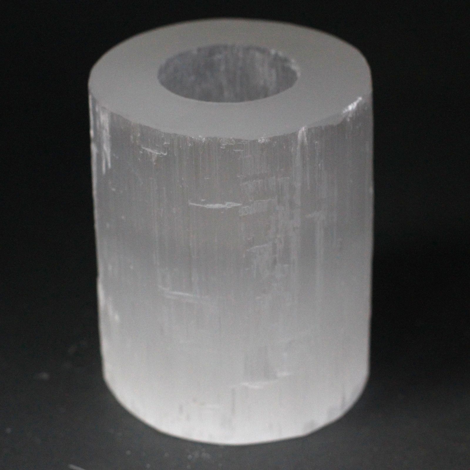 Selenite which is kind of  translucent crystal allows the flame of the candle to flicker slightly through the walls of the candle holder. Edges of the candle holders are rough which is natural to selenite.Selenite Candle Holders are shiny and sometimes with whiter areas. Top of each candle holder is polished and the underside is cut flat.Sizes: Diameter 8cm, Height 10cm