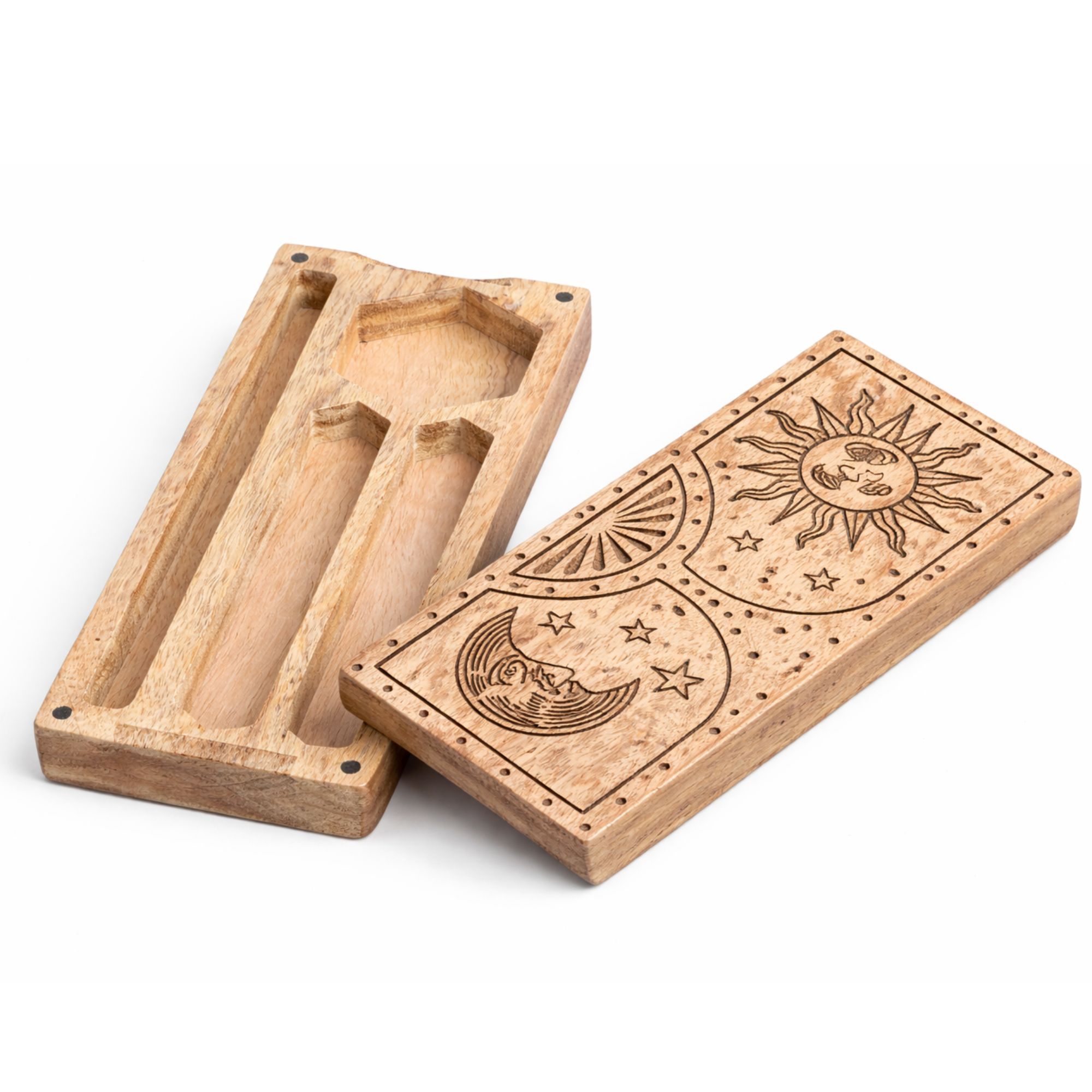 A beautiful and practical storage solution for crystals, stones, and small spiritual tools. This Sun & Moon Carved Crystal and Stone Box features detailed celestial engravings, bringing a mystical and decorative touch to any display. Inside, the box is thoughtfully divided into compartments, making it easy to organise crystals, tumble stones, jewellery, or small ritual items. The slim rectangular shape makes it ideal for shelves, counters, or altar spaces without taking up too much room.Made from natural wood, each box has its own unique grain and character, giving it an authentic, handcrafted feel that customers love.