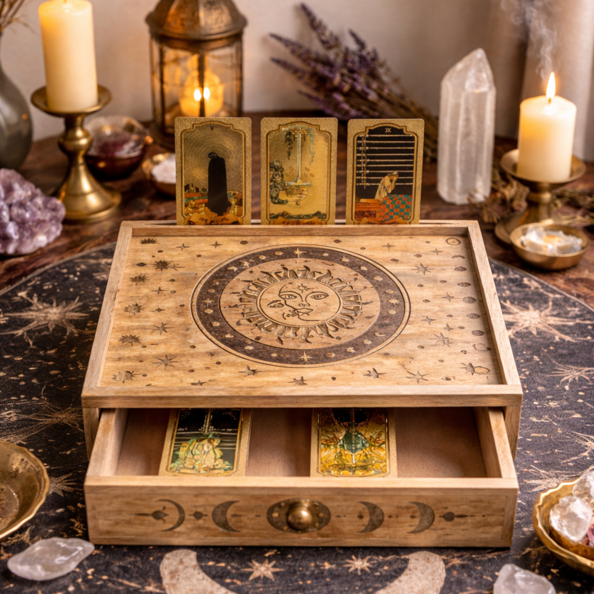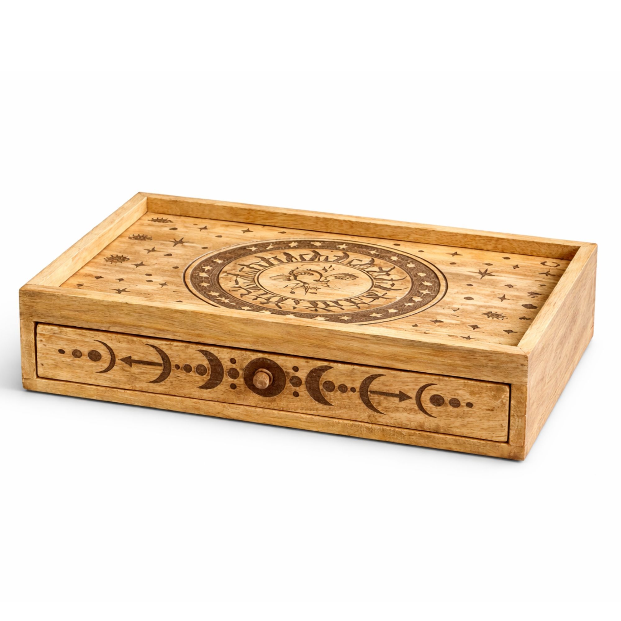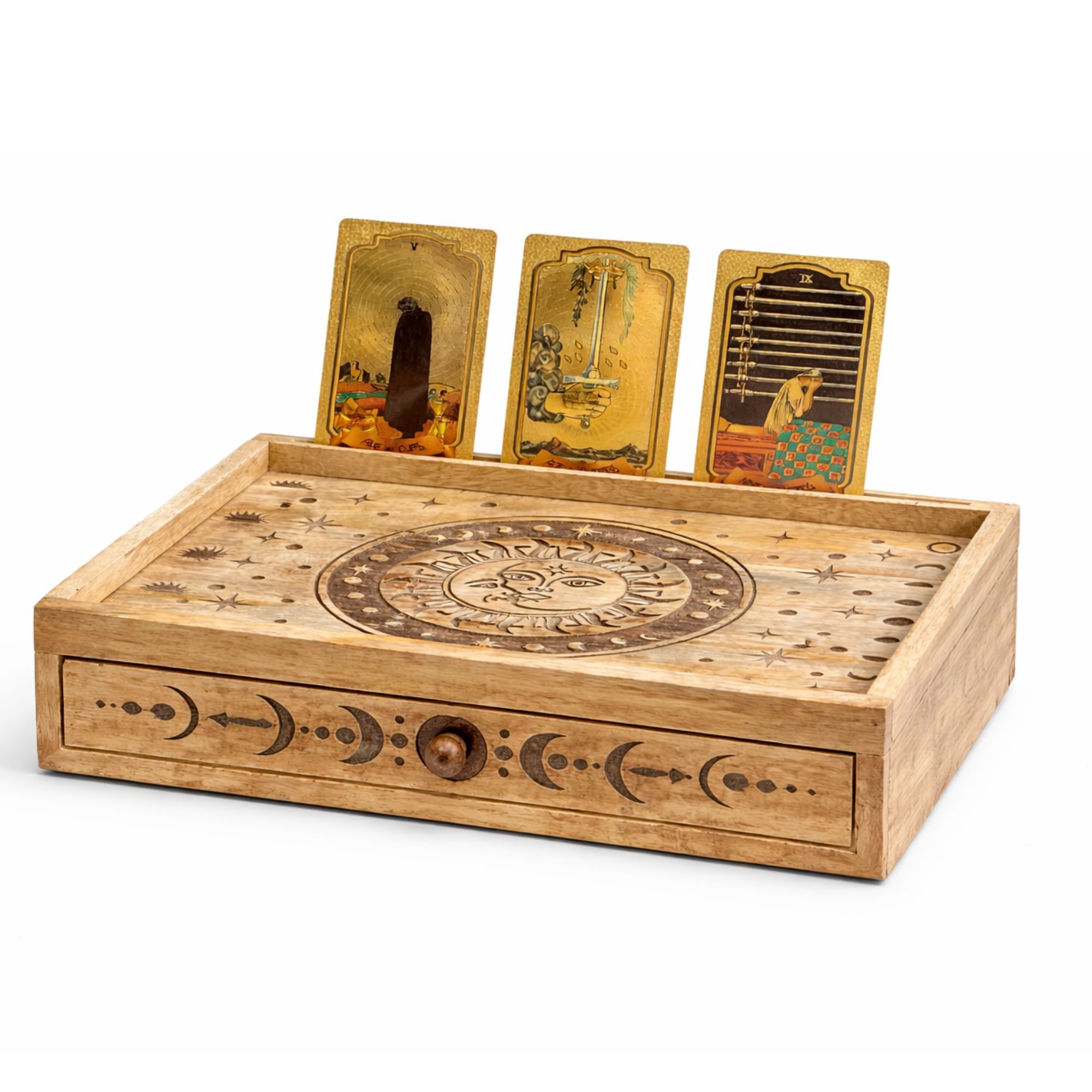 Create a beautiful and organised space for your tarot practice with this Sun Moon Carved Tarot Box with Drawer. Featuring a detailed celestial design with sun, moon, and star motifs, this piece brings both function and atmosphere to your readings. The top surface provides a dedicated area for laying out cards, while the built-in card holder allows you to display your selected cards during readings. A spacious drawer underneath keeps tarot decks, crystals, or small ritual tools neatly stored and within easy reach.Crafted from natural wood, each box has its own unique grain and character, giving it a warm, handcrafted feel. Whether used for daily readings or as a decorative piece on an altar or shelf, it adds a calm and meaningful touch to any space.Perfect for tarot readers, spiritual enthusiasts, or as a thoughtful gift for someone starting their tarot journey.
